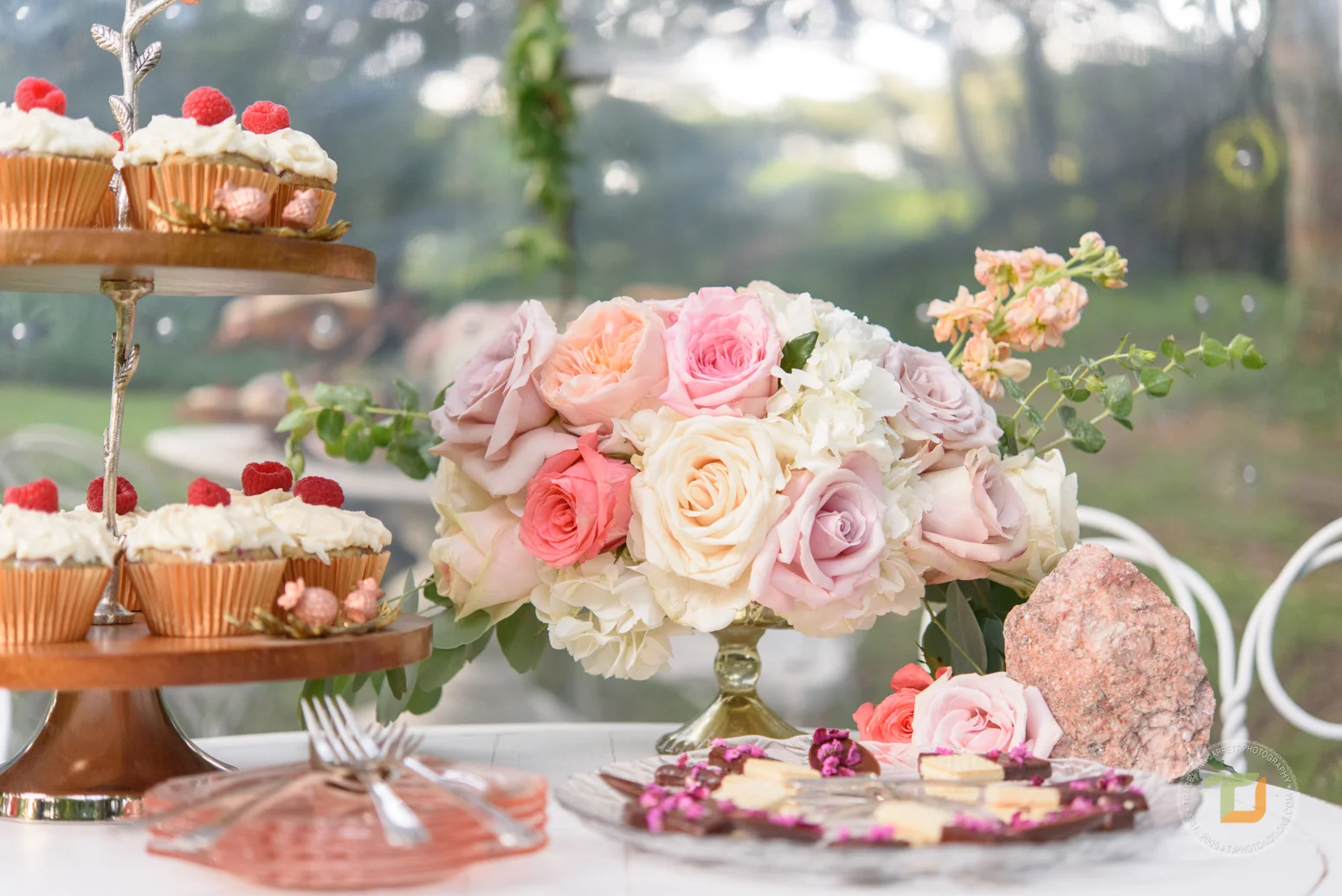 Raspberry sour cream cupcakes with cream cheese frosting, a lush bouquet, chocolate and dried rose petal dipped spoons were available. As well as a chilled grapefruit spritzer with a rosemary garnish with a curated cheese board were also at her disposal.