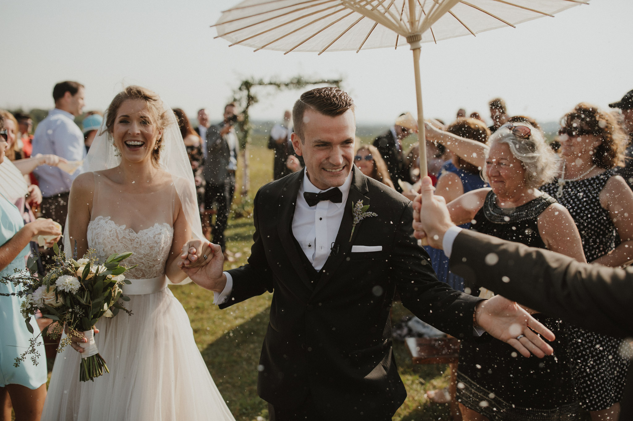 The ceremony, officiated by Rev. Kellerman, takes place at 5 p.m. on the grounds, amidst a wide expanse of open field. With enough sunlight showering down still, the handsome couple stand ready to exchange vows before a verdant vine-wrapped arbor.